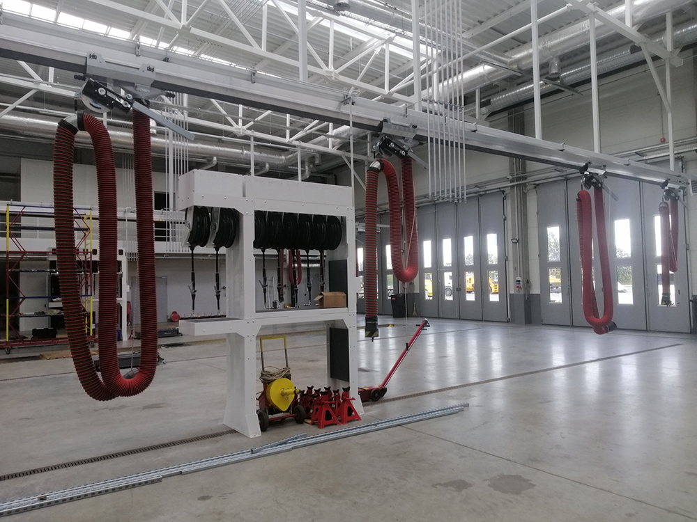 Область применения и описание:Вытяжной самоуплотняющийся канал тип KOS-AL предназначен для вытяжки выхлопных газов с помощью передвижного вытяжного устройства c балансиром тип OBP/Р-AL или передвижной вытяжки OP-AL, которая перемещается вдоль канала. Перемещение устройства происходит с помощью шланга c воздухоприемной насадкой. Насадка одевается на выхлопную трубу обслуживаемого автомобиля. Канал предназначен для обслуживания легковых и грузовых автомобилей. Конструкция:Канал KOS-AL состоит из алюминиевых сегментов длиной 2 или 4 м, соединяемых на произвольную длину в зависимости от производственной необходимости. Вдоль канала перемещается каретка вытяжного устройства с балансиром и шлангом. Насадка шланга одевается на выхлопную трубу автомобиля. Передвижная каретка имеет заслонку, которая открывается и закрывается одновременно с опусканием и подниманием эластичного шланга. При подключении нескольких кареток к общей инсталляции и коэффициенту одновременного использования кареток меньше 1, заслонка дает возможность применения вентилятора с меньшей производительностью. Канальная вытяжка закрепленная на каретке, скользит между двумя резиновыми заслонками. Заслонки прижимаются к каналу за счет разрежения, создаваемого в канале вытяжным вентилятором. Вытяжное устройство оснащено балансиром позволяющим вытягивать шланг на необходимую длину, а также храповым механизмом (арретиром), позволяющим фиксировать вытягиваемый шланг с насадкой в удобном положении. При автоматически отсоединяемой насадке, в конце канала срабатывает механизм отключения и шланг с насадкой поднимается вверх, возвращаясь в исходное положение. При применении насадки с ручным отсоединением, по отсоединению насадки необходимо легко потянуть за шланг, тем самым приводя в действие поднимающий его балансир. Фиксаторы, установленные на концах канала, гасят скорость движения вытяжного устройства в крайних положениях. Рекомендуемая высота закрепления канала составляет от 3 до 4 м. Вытяжные трубопроводы можно подсоединять как к любому концу канала, так и к его верхней стенке. Рельсовая вытяжная система KOS-AL. и OBP/P-AL с гибким шлангом диаметром 100 мм применяется для легковых автомобилей, с диаметром 125 мм – для грузовых автомобилей с грузоподъемностью не больше 3,5 т и диаметром 150 мм – для большегрузных автомобилей. Выбор диаметра шланга зависит от объема двигателя автомобиля и его скорости вращения. Для правильного подбора системы рекомендуем обратиться в фирму KLIMAWENT. В качестве дополнительного оснащения предлагается радиоуправление, с помощью которого автоматически включается вентилятор во время опускания шланга с насадкой. После окончания работы вентилятор выключится с временным опозданием (см. карта каталога радиоуправление).