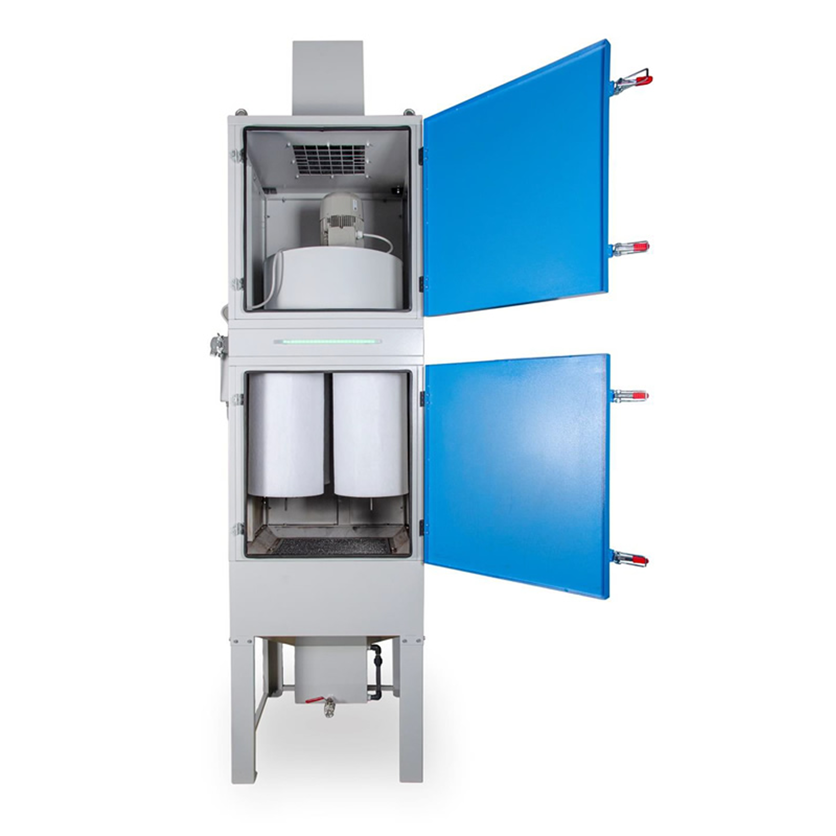 Принцип работы:Воздушный поток с масляным туманом, частицами масла, СОЖ, проходит через картридж-фильтры, покрытые слоем полипропиленовой мембраны. Благодаря низкой скорости прохождения воздуха (не более 0,6 м/с), обеспечивается высокая степень очистки воздуха и от вредных веществ с дальнейшим их осаждением в сборном резервуаре, который периодически необходимо очищать через встроенный сливной кран.
